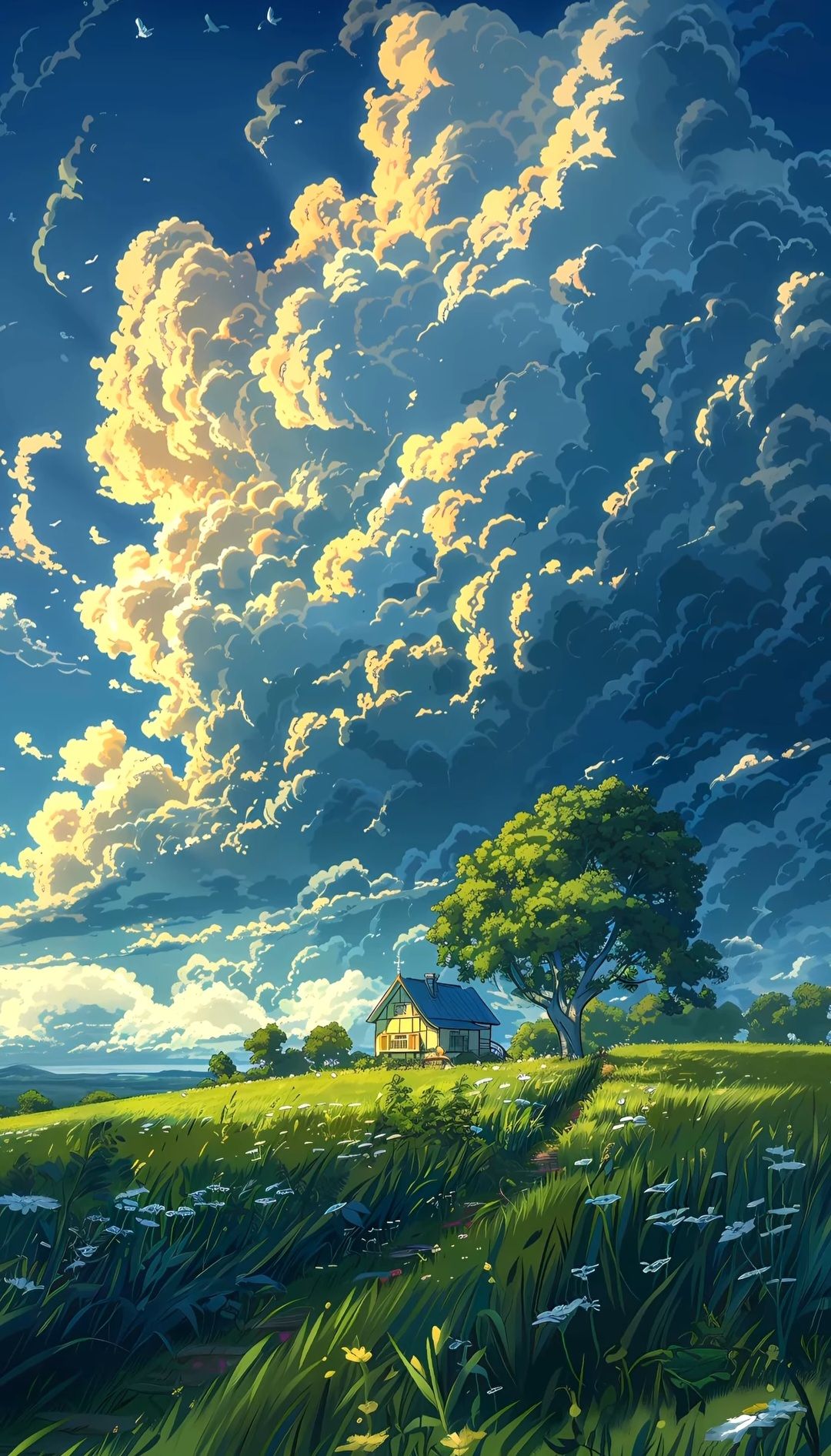 High-quality anime mobile wallpaper: cloudy sky with green meadow house. Perfect for your smartphone screen. Download Wallpapers