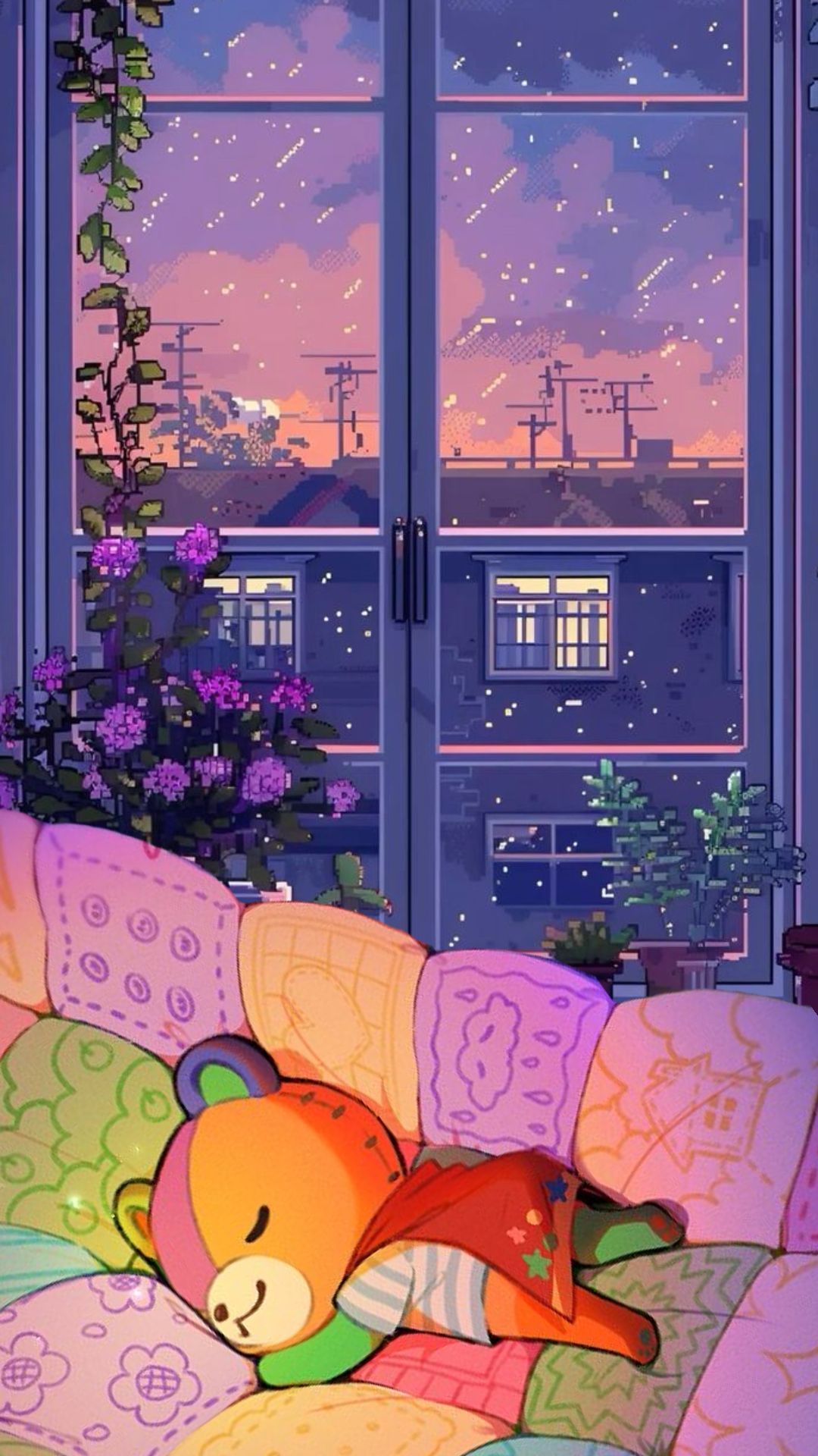 High-quality gaming mobile wallpaper: cozy nighttime teddy bed scene. Perfect for your smartphone screen. Download Wallpapers