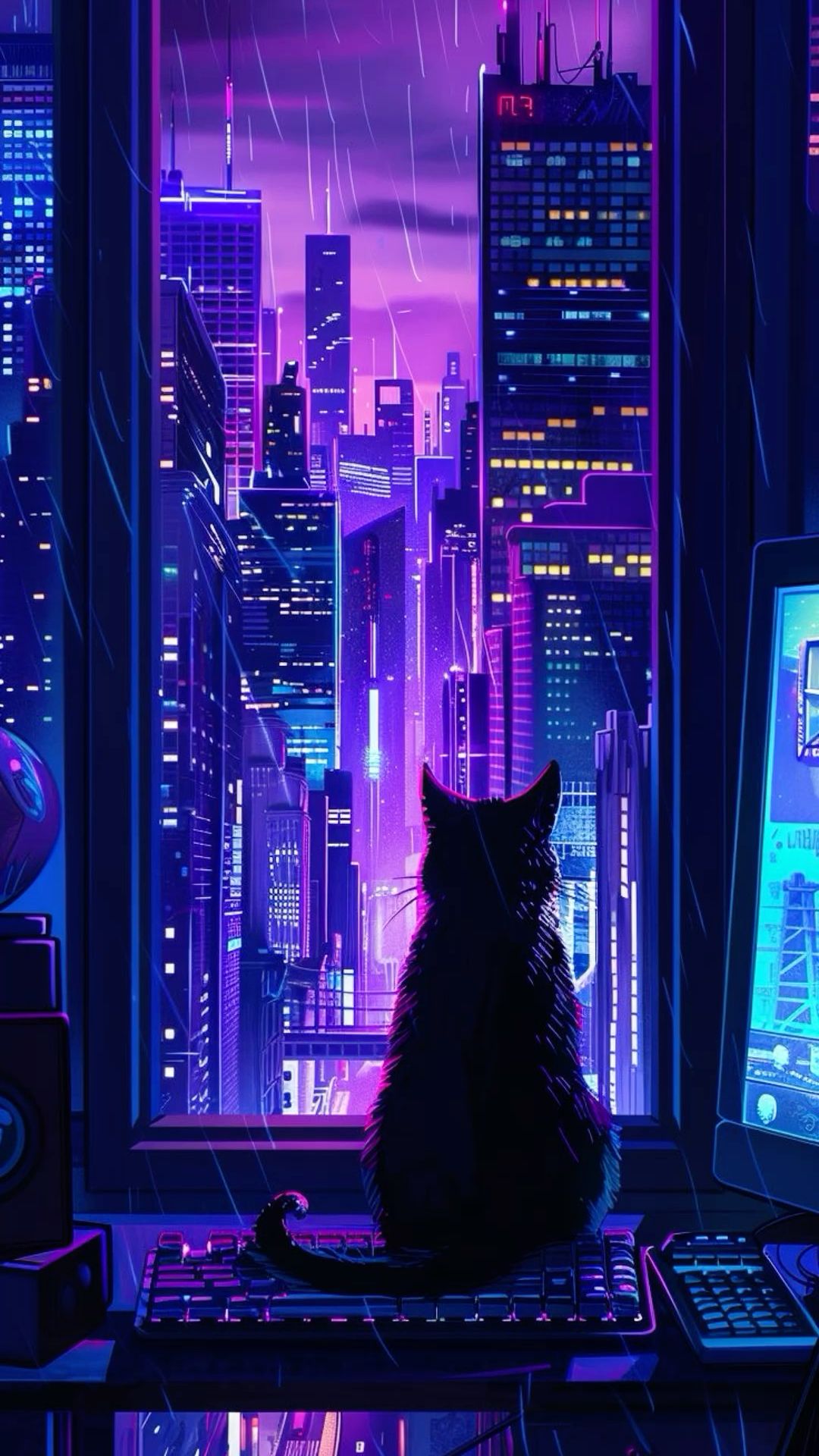 High-quality cyberpunk mobile wallpaper: cyberpunk cat at neon cityscape. Perfect for your smartphone screen. Download Wallpapers
