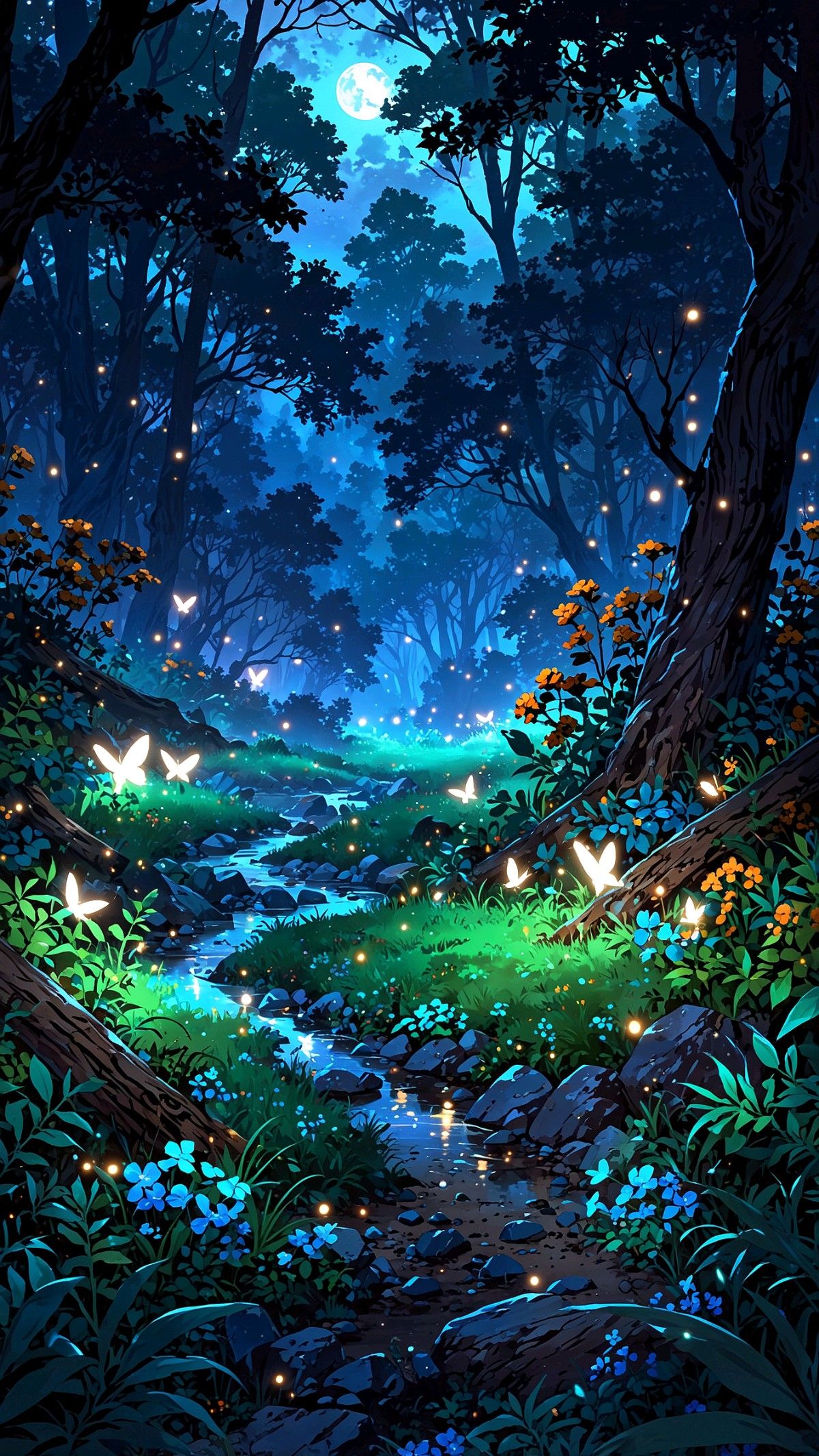 High-quality anime mobile wallpaper: enchanted forest fireflies glow. Perfect for your smartphone screen. Download Wallpapers