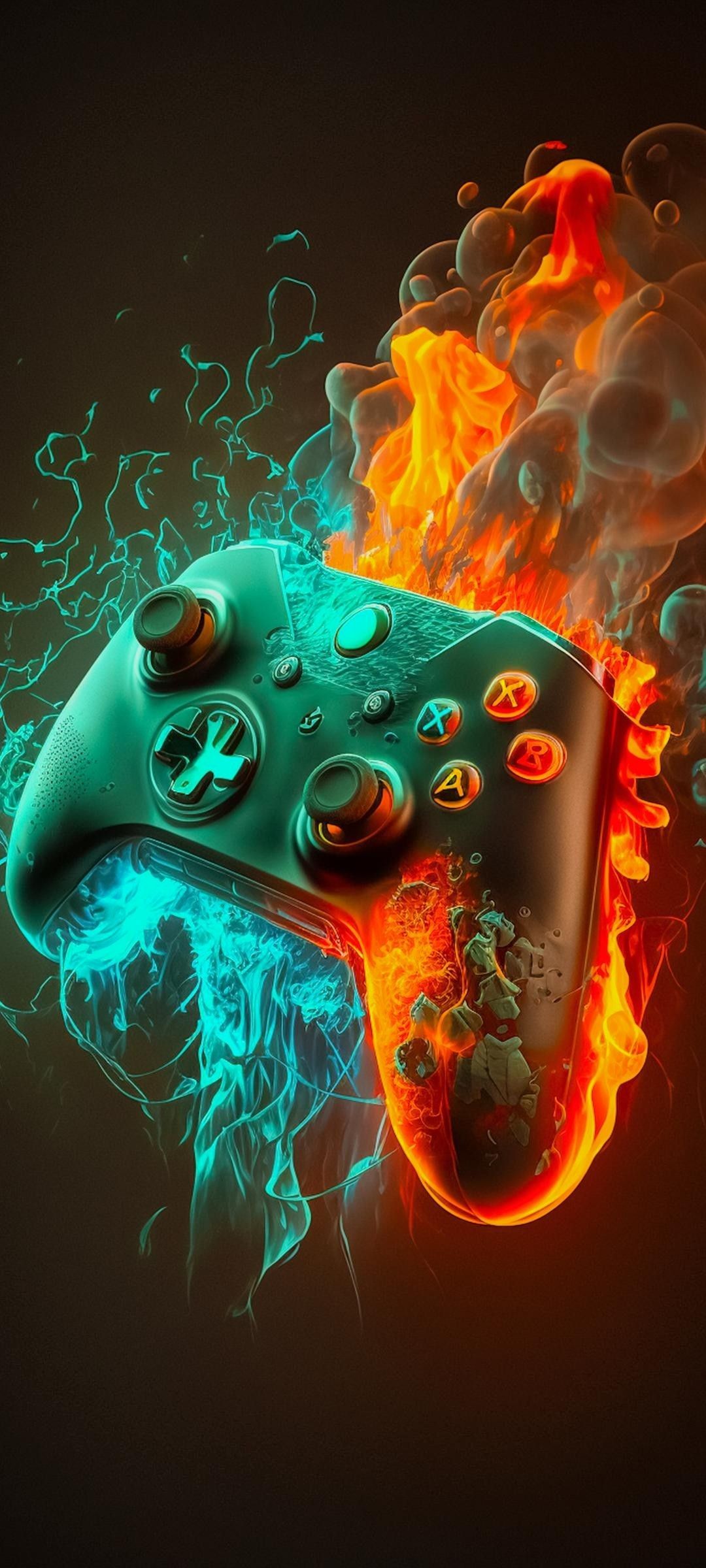 High-quality gaming mobile wallpaper: fiery gaming controller close-up. Perfect for your smartphone screen. Download Wallpapers