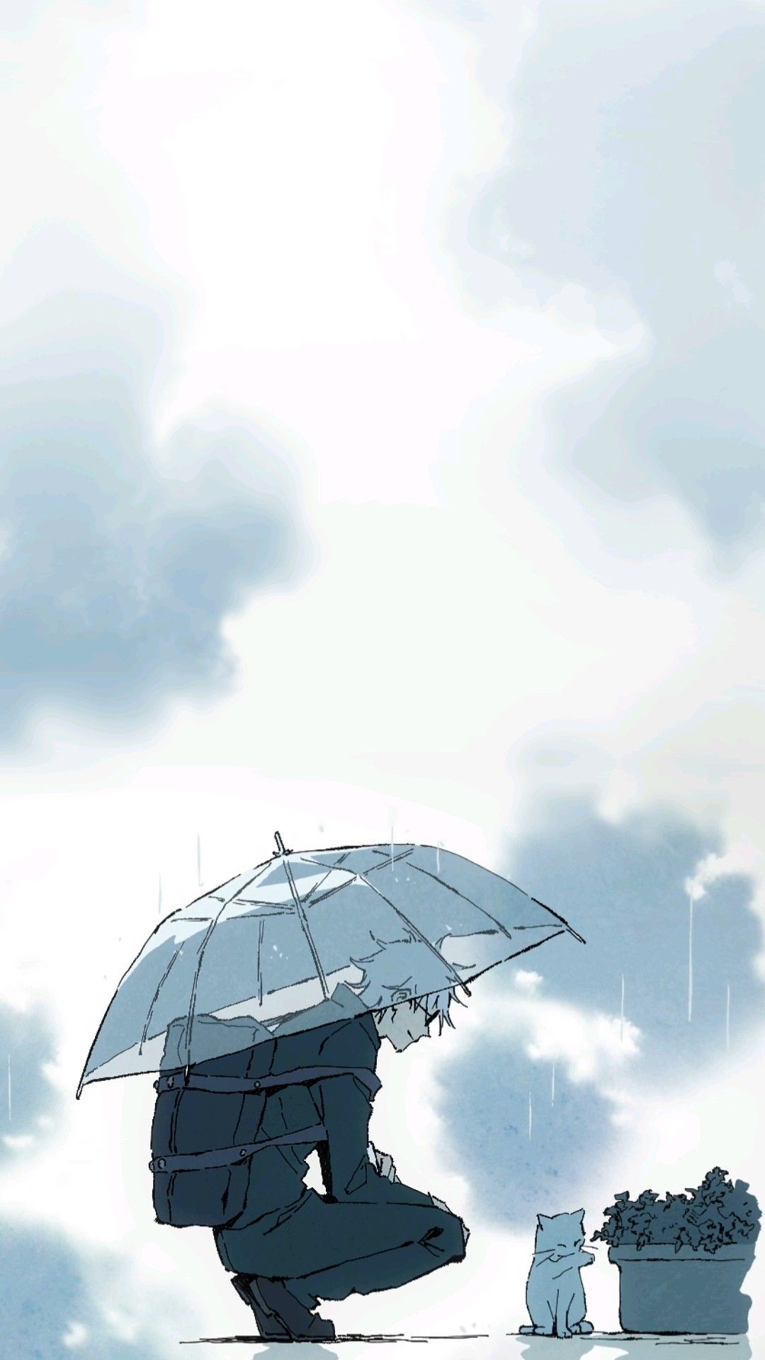 High-quality anime mobile wallpaper: kneeling figure with umbrella and cat. Perfect for your smartphone screen. Download Wallpapers