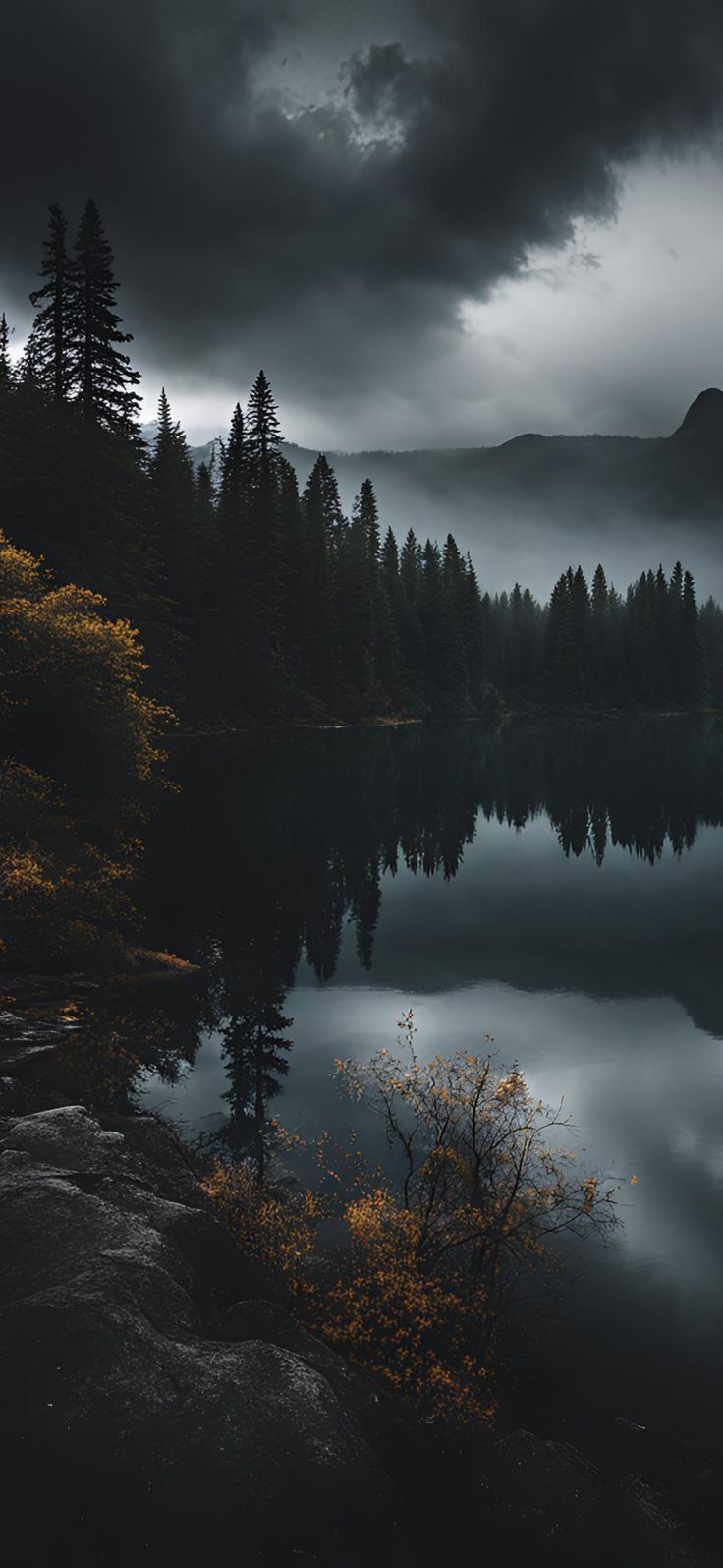 High-quality nature mobile wallpaper: misty lakeside forest reflection. Perfect for your smartphone screen. Download Wallpapers