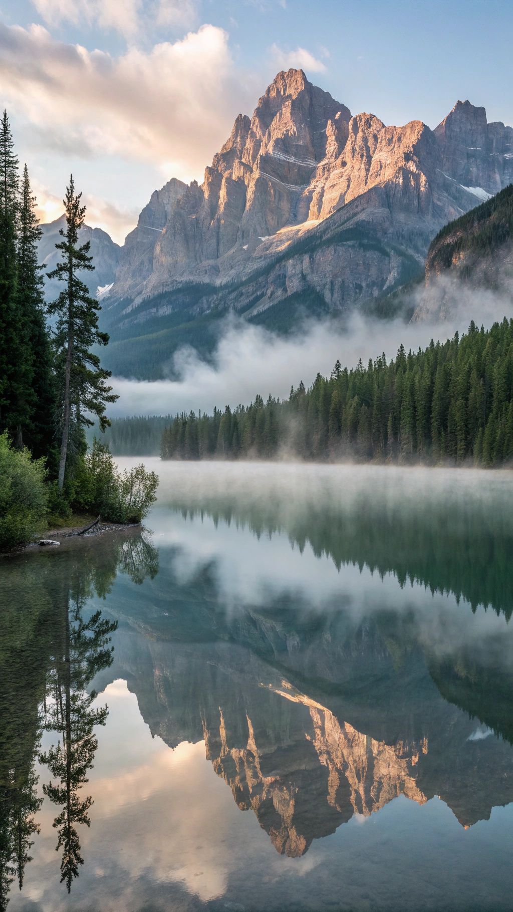 High-quality nature mobile wallpaper: misty mountain reflections over lake. Perfect for your smartphone screen. Download Wallpapers