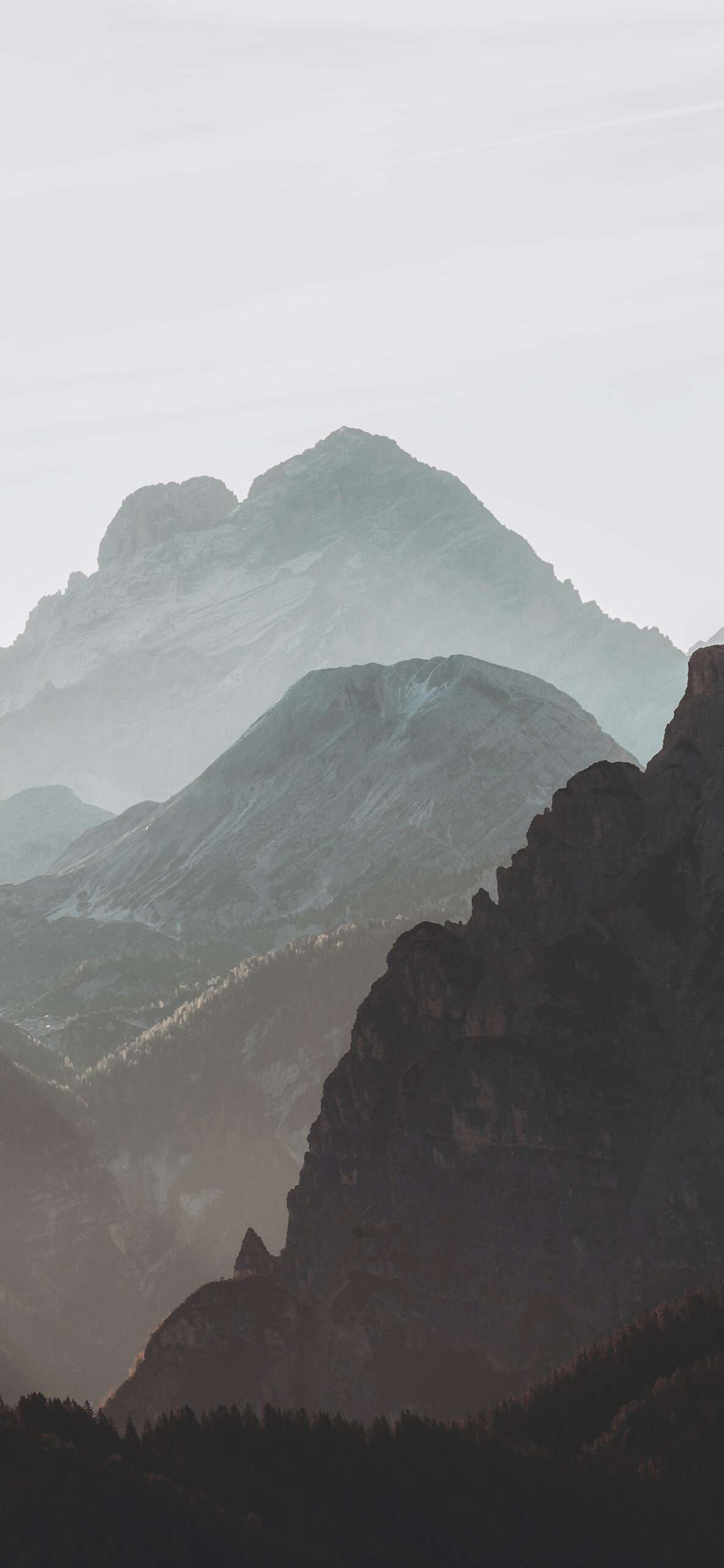 High-quality minimalist mobile wallpaper: misty mountain sunrise glow. Perfect for your smartphone screen. Download Wallpapers