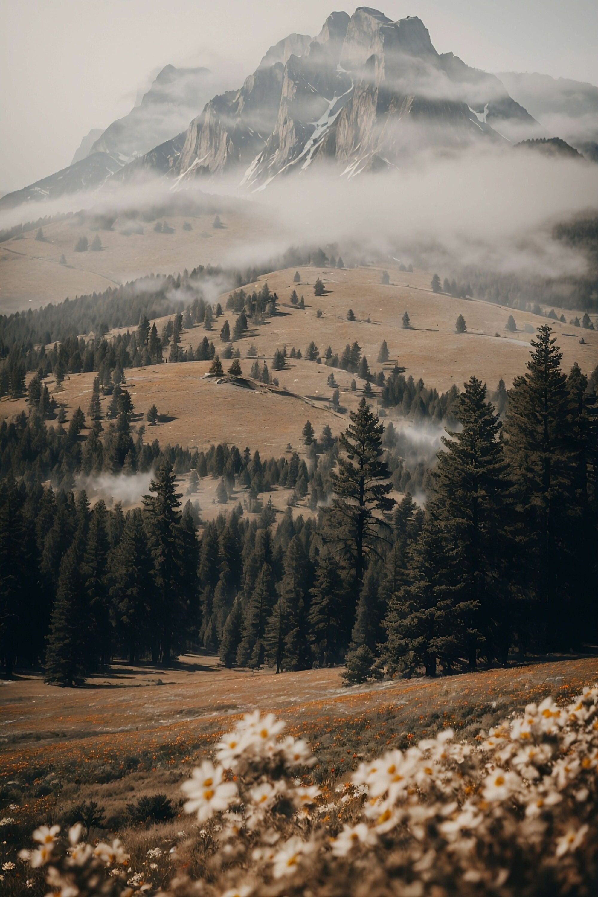 High-quality nature mobile wallpaper: misty mountains with blooming wildflowers. Perfect for your smartphone screen. Download Wallpapers