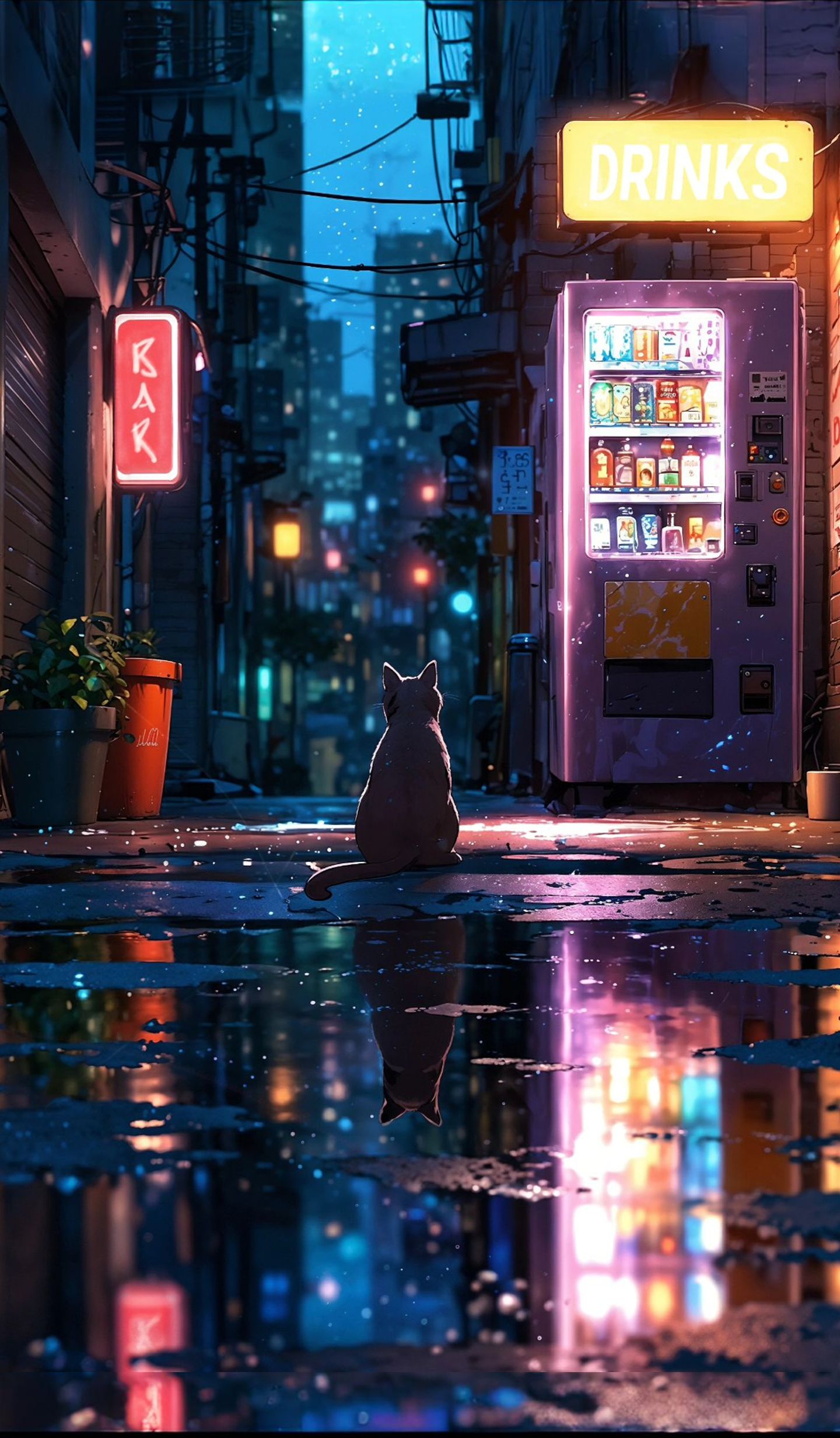 High-quality cyberpunk mobile wallpaper: neon cat by futuristic vending machine. Perfect for your smartphone screen. Download Wallpapers