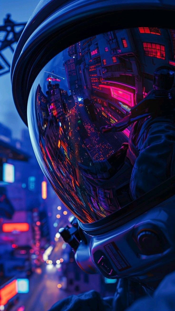 High-quality cyberpunk mobile wallpaper: neon cityscape in space helmet. Perfect for your smartphone screen. Download Wallpapers