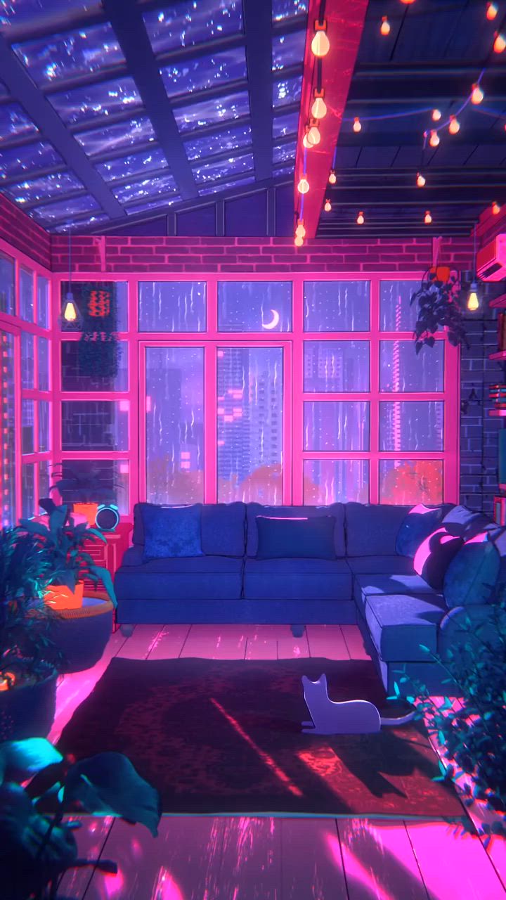 High-quality cyberpunk mobile wallpaper featuring neon-lit living room futurism. Perfect for smartphone screens. Download Wallpapers