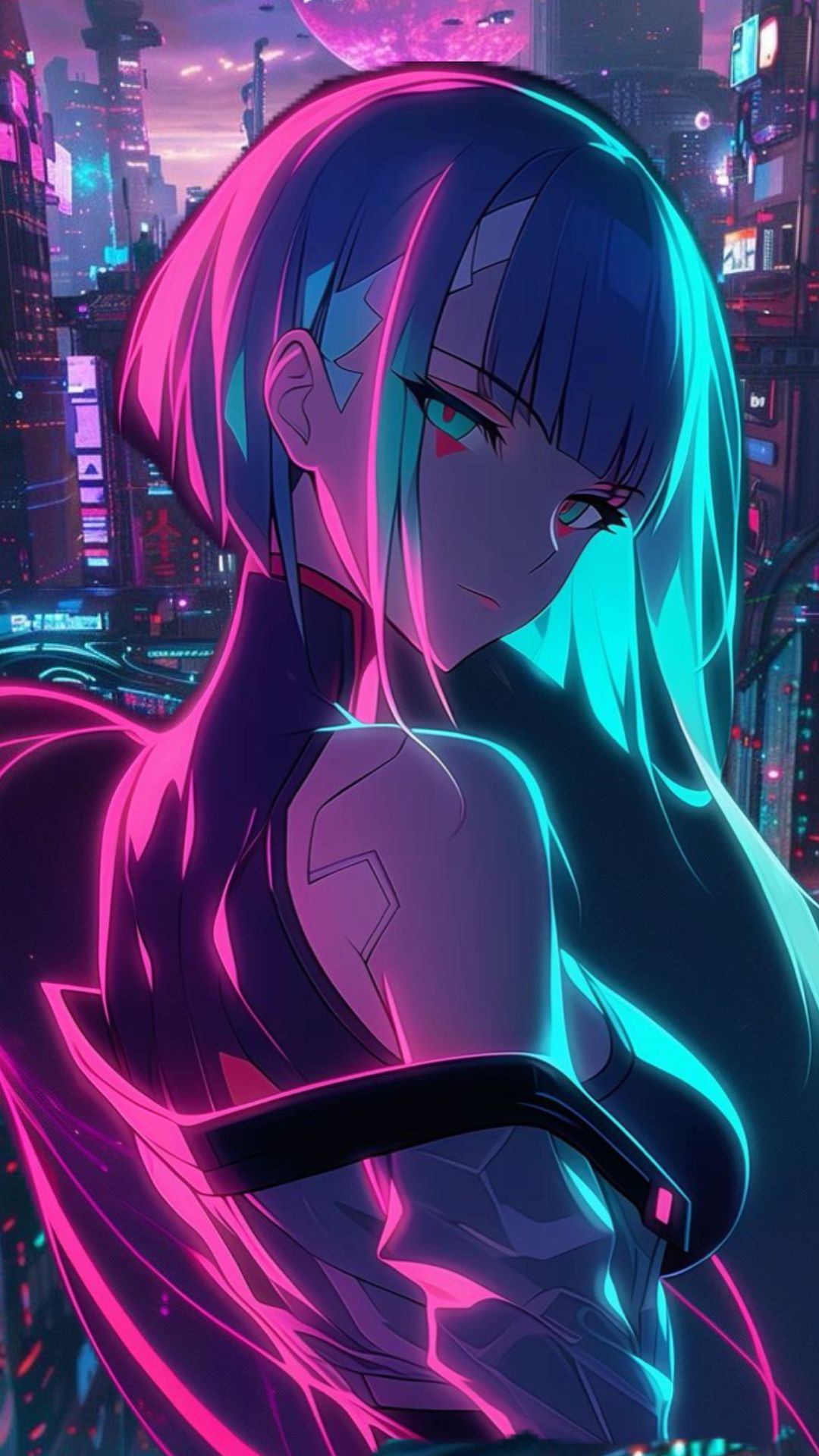 High-quality cyberpunk mobile wallpaper: neon skyline cyberpunk scene. Perfect for your smartphone screen. Download Wallpapers