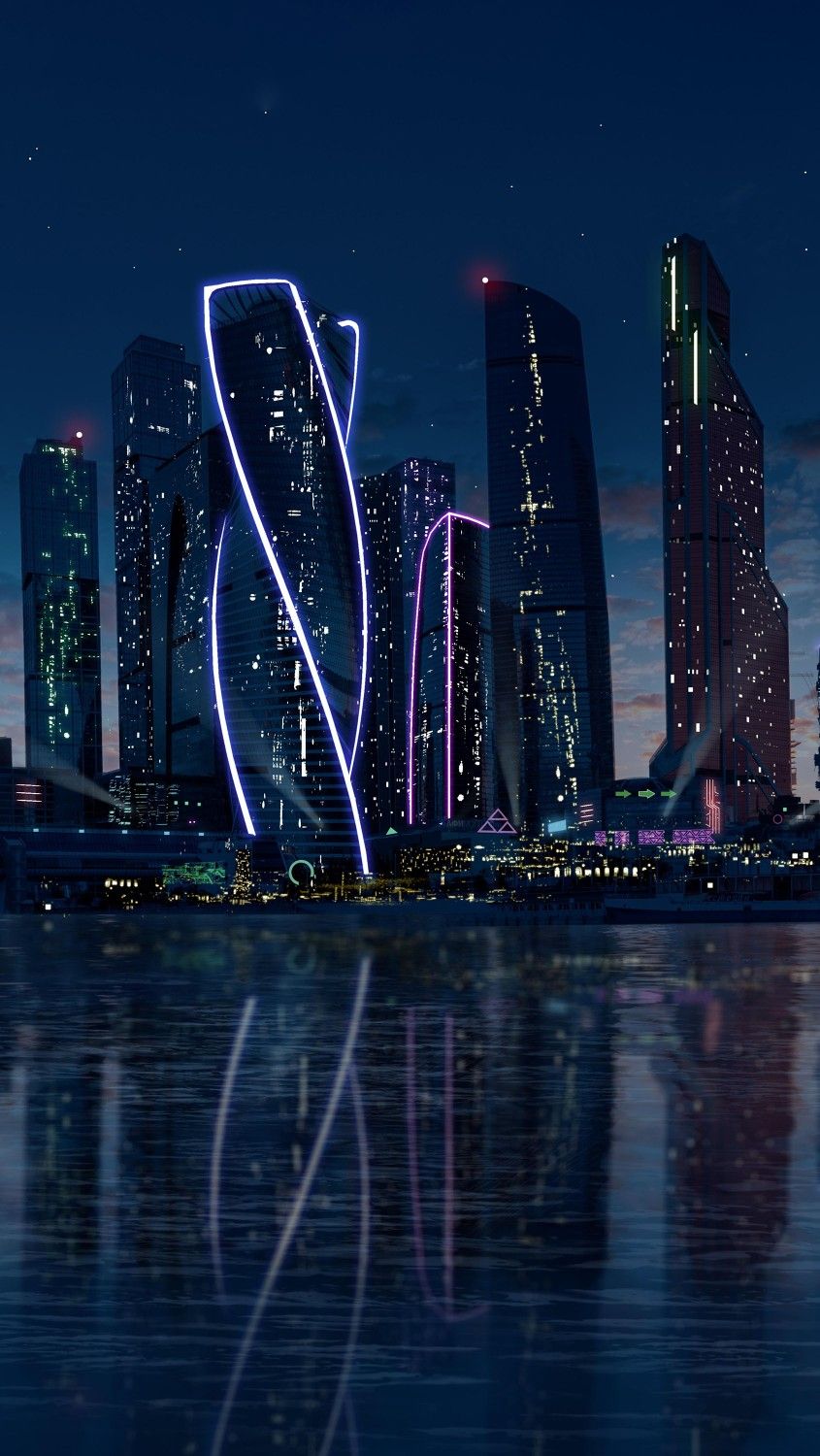 High-quality cyberpunk mobile wallpaper: neon skyline night reflection. Perfect for your smartphone screen. Download Wallpapers