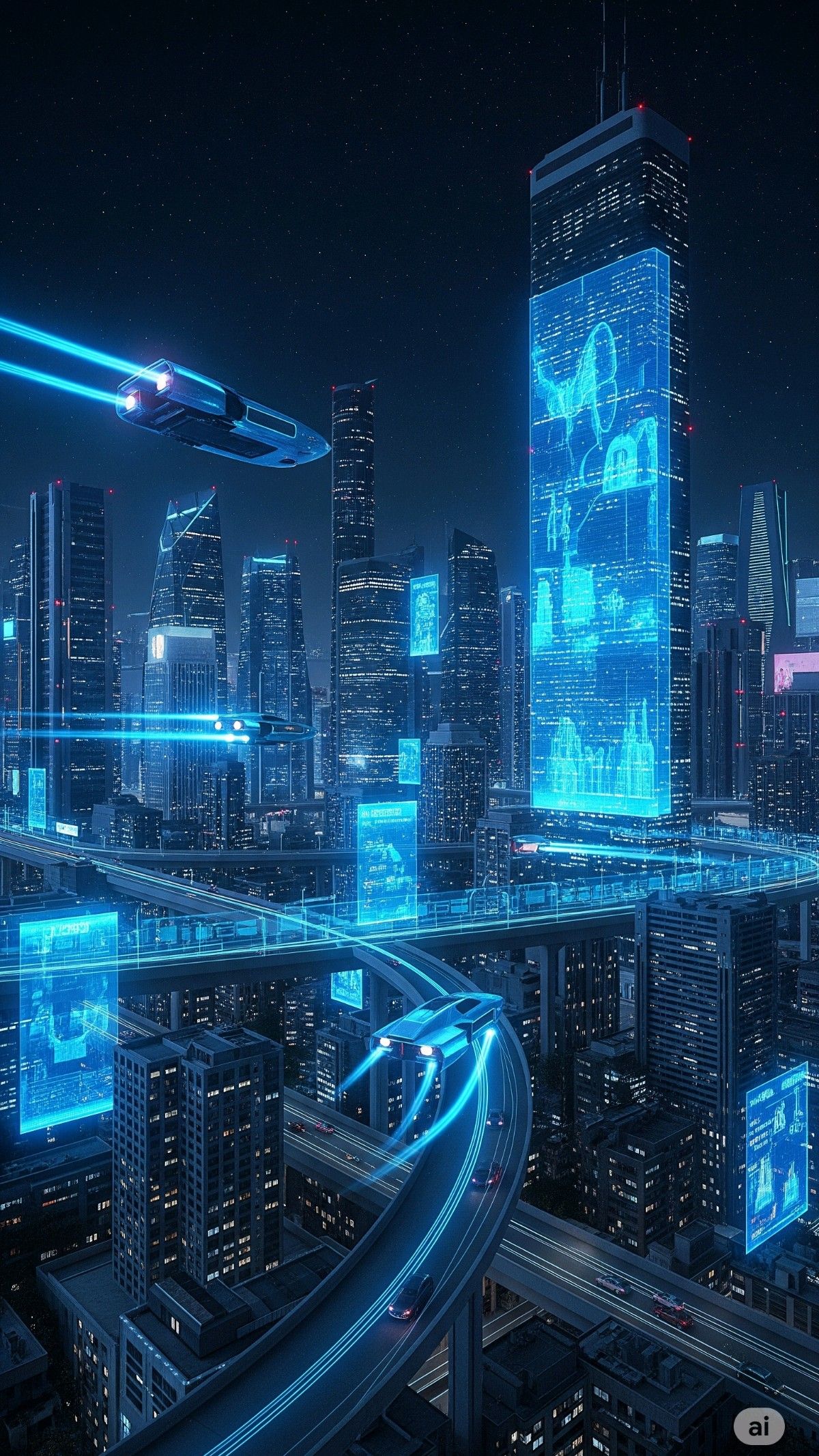 High-quality cyberpunk mobile wallpaper: neon skyline with holograms and flyers. Perfect for your smartphone screen. Download Wallpapers