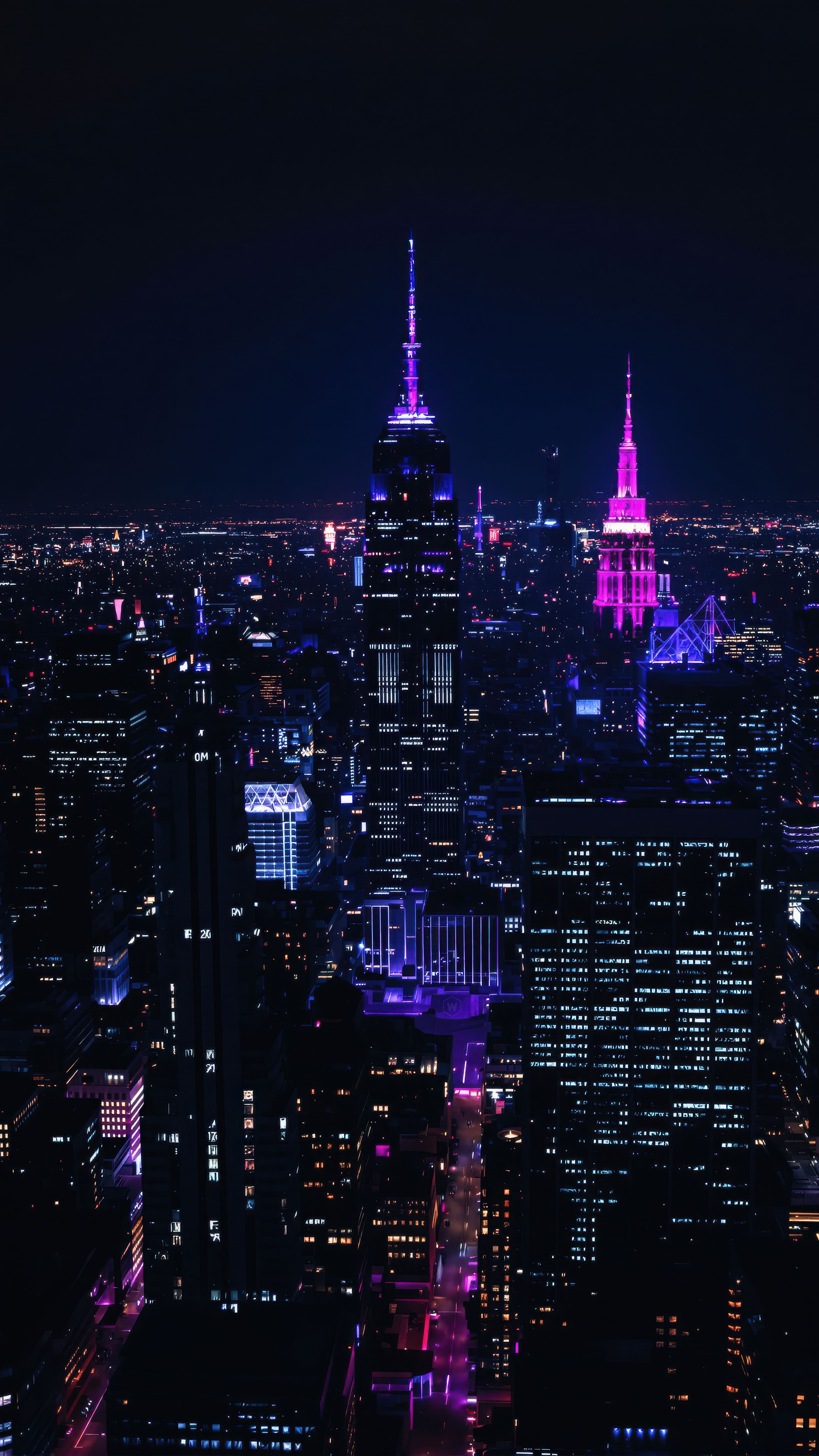 High-quality cyberpunk mobile wallpaper: neon skyscrapers aerial nightscape. Perfect for your smartphone screen. Download Wallpapers