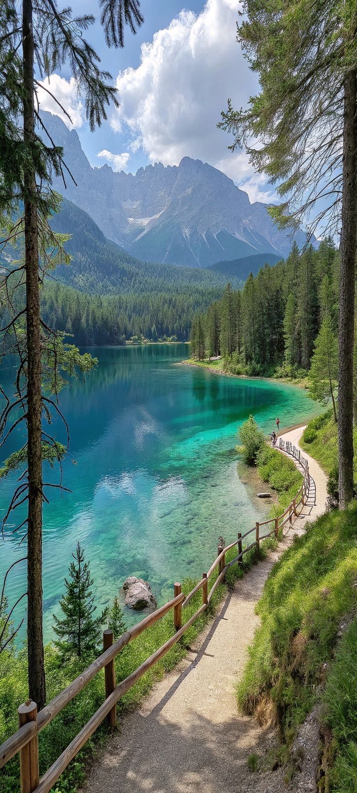High-quality nature mobile wallpaper: serene lake path mountain view. Perfect for your smartphone screen. Download Wallpapers