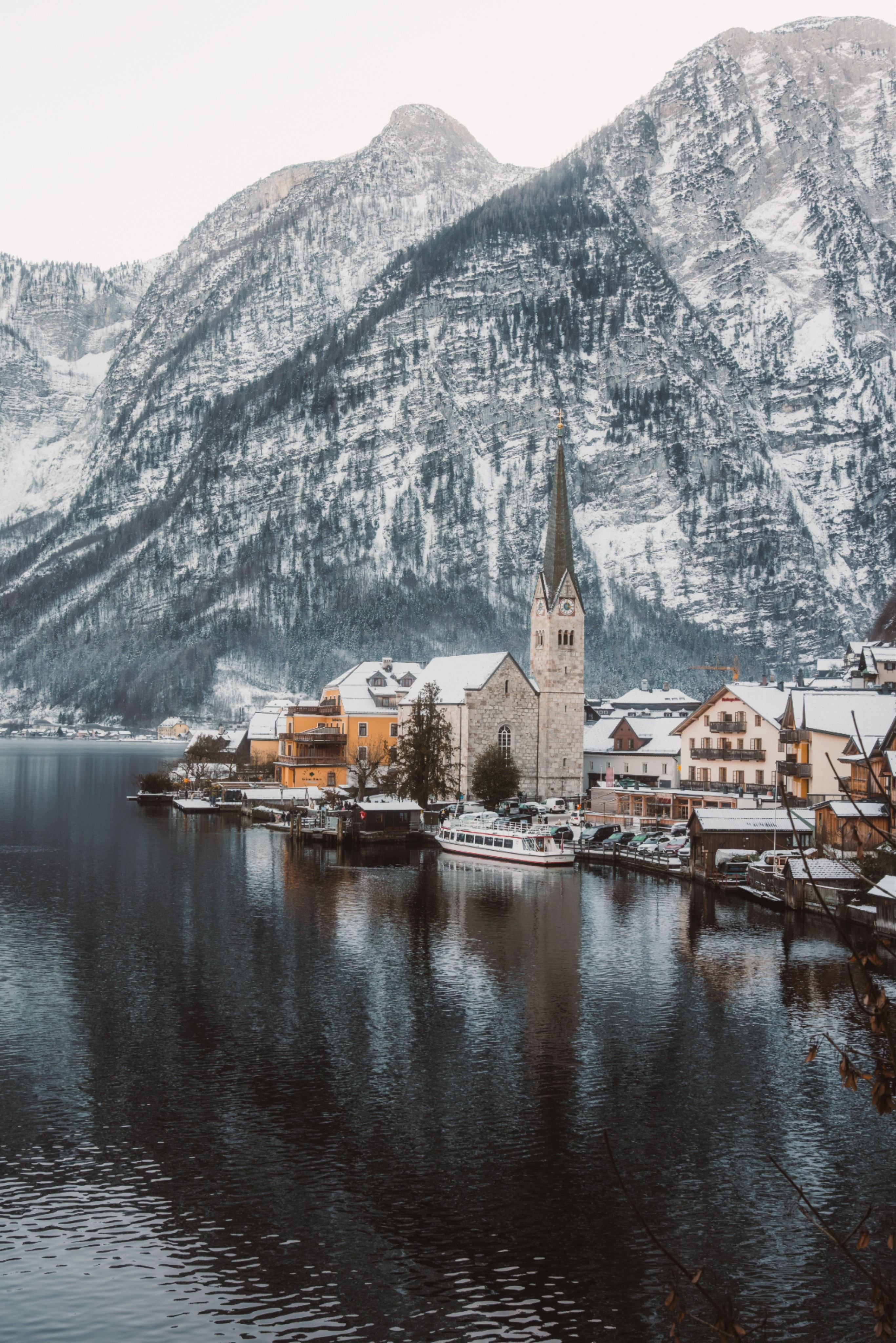 High-quality nature mobile wallpaper: snowy peaks over lakeside village. Perfect for your smartphone screen. Download Wallpapers